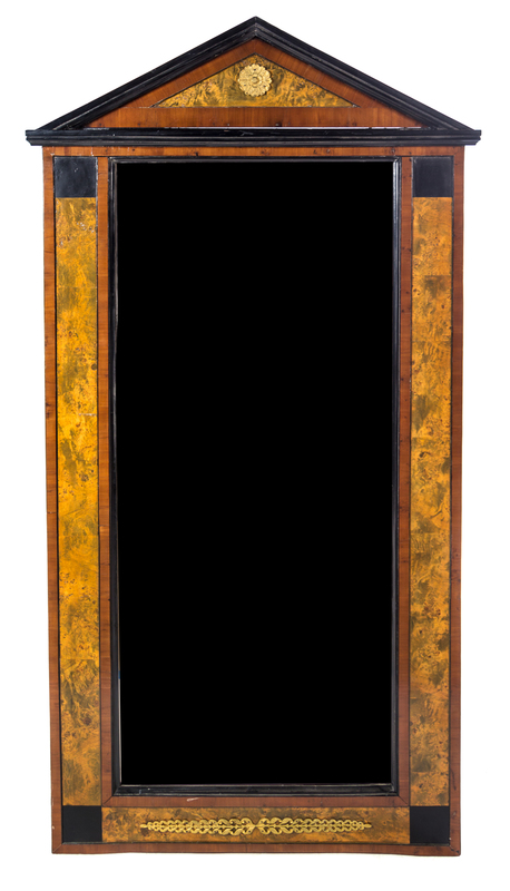 A Biedermeier Parcel Ebonized Fruitwood and Burlwood Pier Mirror