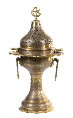 the domed lift-off cover with pierced decoration and surmounted by a star and crescent moon finial, over a similarly worked basin flanked by loose-ring handles on a shaped foot.