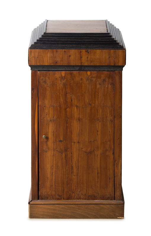 having a stepped top over a sliding compartment and a single door, raised on a plinth base.