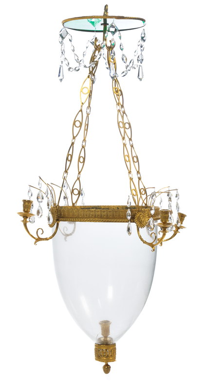 the circular green glass corona issuing four chains suspending a lantern of inverted bell form, enclosing a candle cup and further issuing four foliate scroll candle arms cast with male masks, terminating in an openwork foliate and acorn finial and hung with prisms and swags throughout, not electrified.