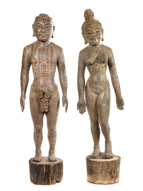 each figure standing on a cylindrical stand, the semi-naked body with numerous acupuncture holes and inscriptions written in black ink.