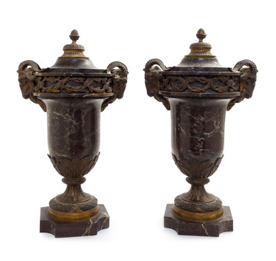 A Pair of Neoclassical Gilt Bronze Mounted Rouge Marble Urns