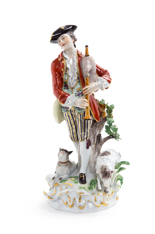 depicting a shepherd playing a bagpipe with a dog and a sheep at his feet, bearing crossed swords in underglaze blue, incised 3 and impressed 136 to the underside.