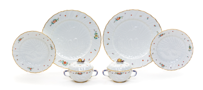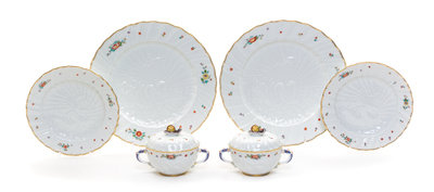 comprising two dinner plates, two salad plates and two covered sugar bowls, each marked with crossed swords in underglaze blue and various impressed, incised and painted numbers to the underside.