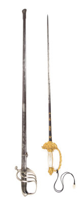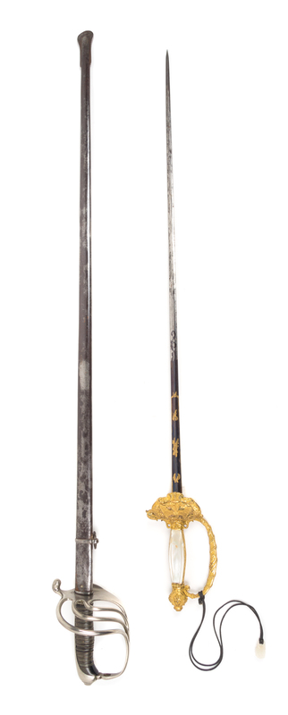 comprising a French diplomat's sword with a mother-of-pearl inset and eagle decorated handle, marked A.B.; a gilt bronze sword with mythological decoration; a foliate decorated ceremonial sword with a simulated shagreen handle; and two gilt bronze mounted swords.