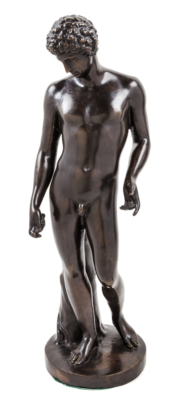 depicting Narcissus, raised on a circular base, apparently unsigned.