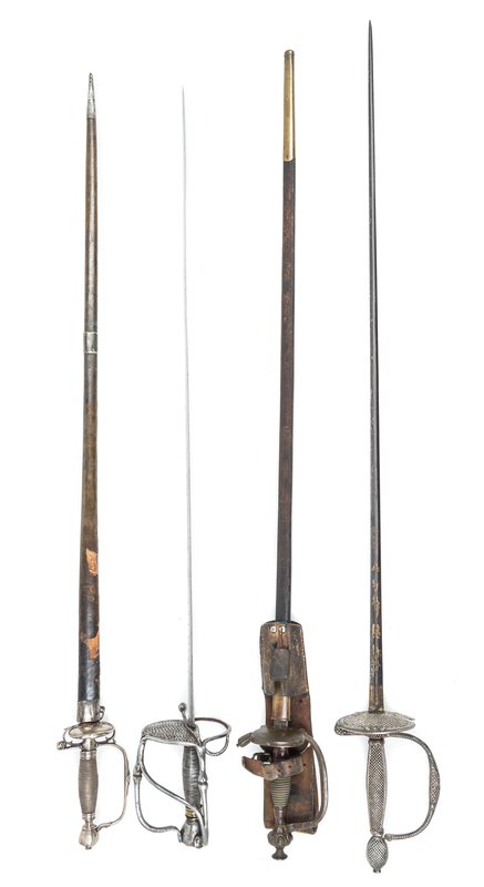 one example with a silvered diamond-cut pattern handle, a chased and gilt sword blade bearing indistinct marks to the handle; two with silvered wire wrapped handles, one with a foliate scroll decorated blade and the other with an incised blade reading In Mini; and a bronze handled example with a foliate chased blade.