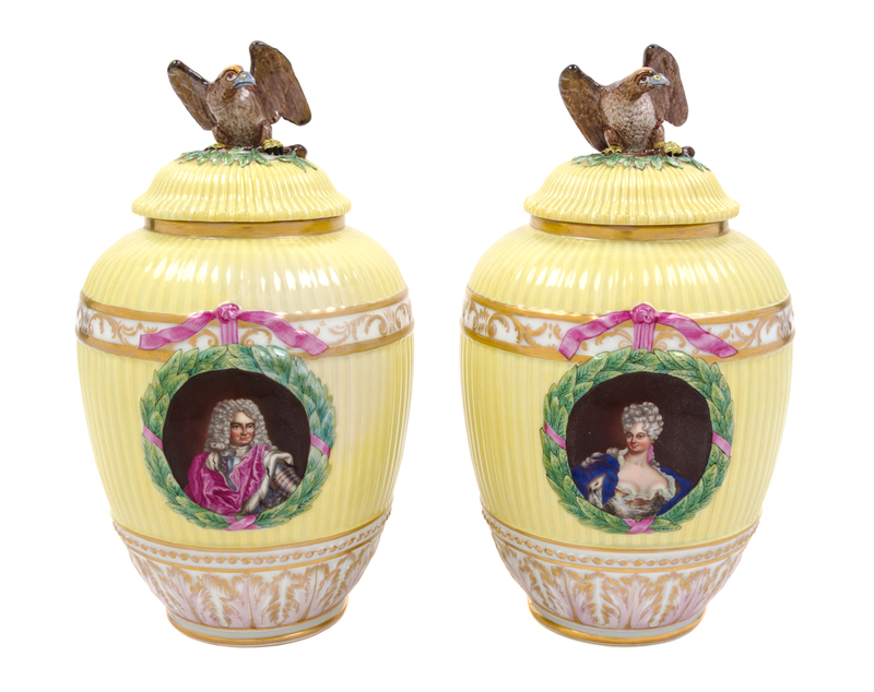 each of ribbed ovoid form with a domed lid surmounted by an eagle, the body painted to depict a royal coat of arms on one side and a royal portrait on the other, marked in underglaze blue to the underside.