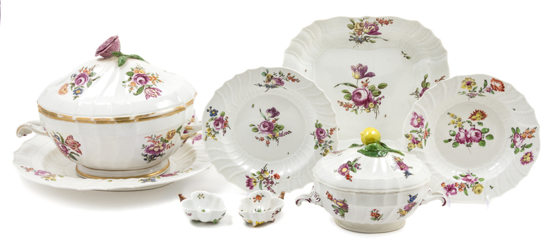 comprising 2 soup tureens, 3 oval platters or underplates, 3 rectangular trays, 4 leaf-shaped nut dishes, 2 sauce boats, a sauce tureen, 8 soup plates (some from the collection of Winterthur Museum), 3 circular platters and 39 plates of slightly varying size, each painted with bouquets of flowers on a white ground and having a beehive mark in underglaze blue to the underside; 65 items total.