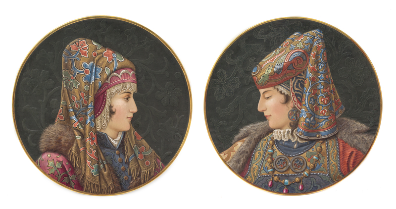 each of circular form, depicting a man and a woman in profile wearing Renaissance style clothing, with impressed and painted marks to the underside.
