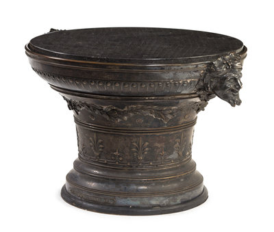 of low form with Bacchic masks, the base marked Chambon Bruxelles, set with a later circular marble top.