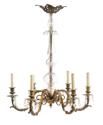 comprising a six-light chandelier and a pair of sconces, wired for electricity.
