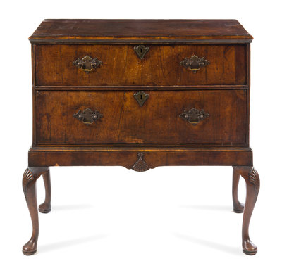 having a rectangular top over the conforming case fitted with two graduated drawers, raised on carved cabriole legs.