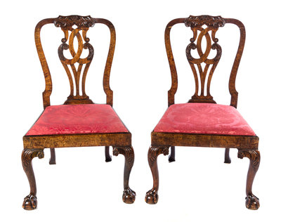 each having a floral and foliate scroll worked crest rail above an open-worked vasiform splat and a drop-in cushion seat, raised on acanthus capped cabriole legs ending in claw and ball feet.