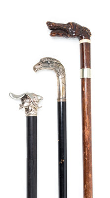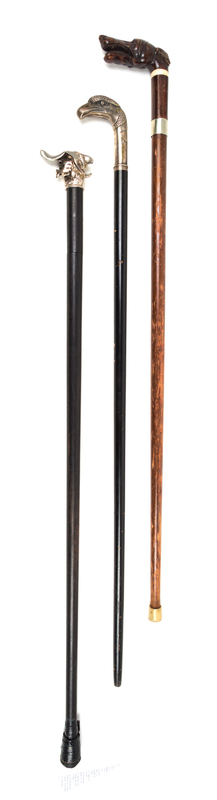 the first having a silver-plate eagle head handle stamped Metal Argente, on an ebonized shaft; the second having a silvered metal bearded grotesque's head handle, on an ebony shaft; the last having a carved wood hound's head handle.