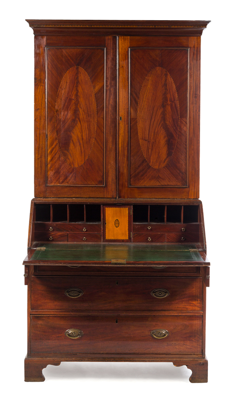 in two parts, the upper section having a molded rectangular cornice over two paneled cupboard doors, the lower section having a slant front opening to a writing surface and a fitted interior, above three graduated long drawers ending in shaped bracket feet.