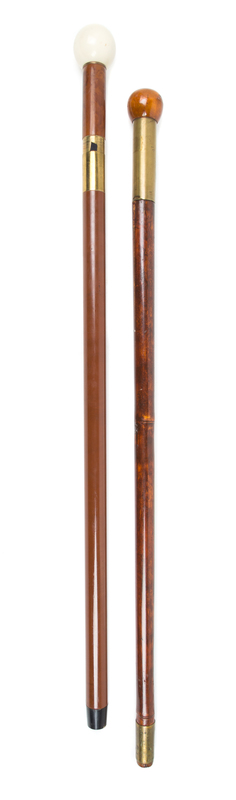 one example having a brass collar and burlwood handle on a bamboo shaft concealing a blade, together with a composite example concealing an umbrella.