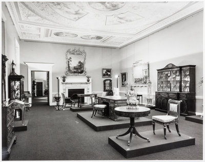 the arched pediment centered by a coat of arms with bellflower garlands above a pierced dentil and arch molded cornice over a banded and paterae inlaid frieze, having four glazed doors with geometric molded-edge mullions enclosing a silk-lined interior, the lower section having a secretary drawer opening to an arrangement of valanced cubbyholes over drawers flanked by four graduated stringed drawers above two doors flanked by two drawers over doors, all with oval banded fronts, set on a plinth base.