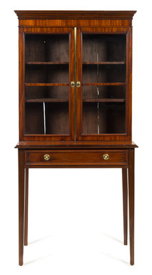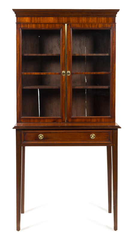 in two parts, the superstructure having a projecting molded cornice above two glazed doors opening to a shelf, the base fitted with a single long drawer raised on square tapering legs.