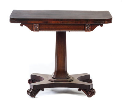 having a rectangular top with rounded fore-corners opening to a square inset felt playing surface, supported on a faceted tapering standard raised on a quadripartite base, ending in scroll feet.