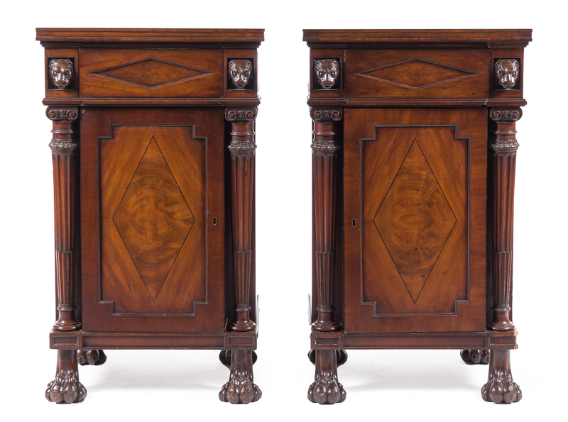 each having a molded rectangular top above a frieze drawer flanked by two lion masks above a cabinet door flanked by fluted Ionic columns, raised on paw feet.