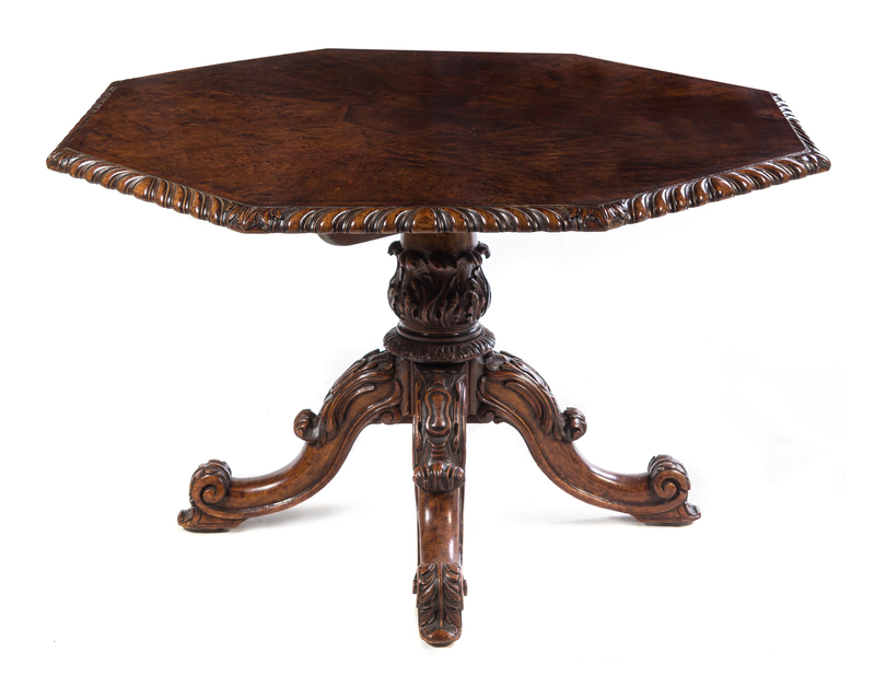 the octagonal top with a gadrooned edge raised on an acanthus carved column ending in four downswept legs with acanthus carved scroll toes and casters.