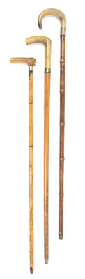 comprising one example with a horn handle above a silver band bearing rubbed marks and a vacant crest; one with a horn handle above a tapering cylindrical shaft; and one example with a carved horn handle.