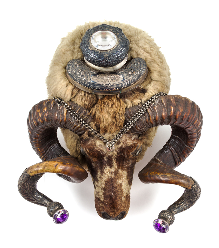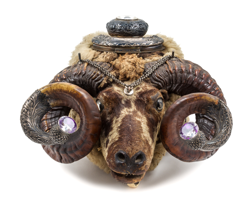 in the form of a jeweled ram's head, having silver capped horns, cigar and tobacco compartments, further hung with chains suspending tools.