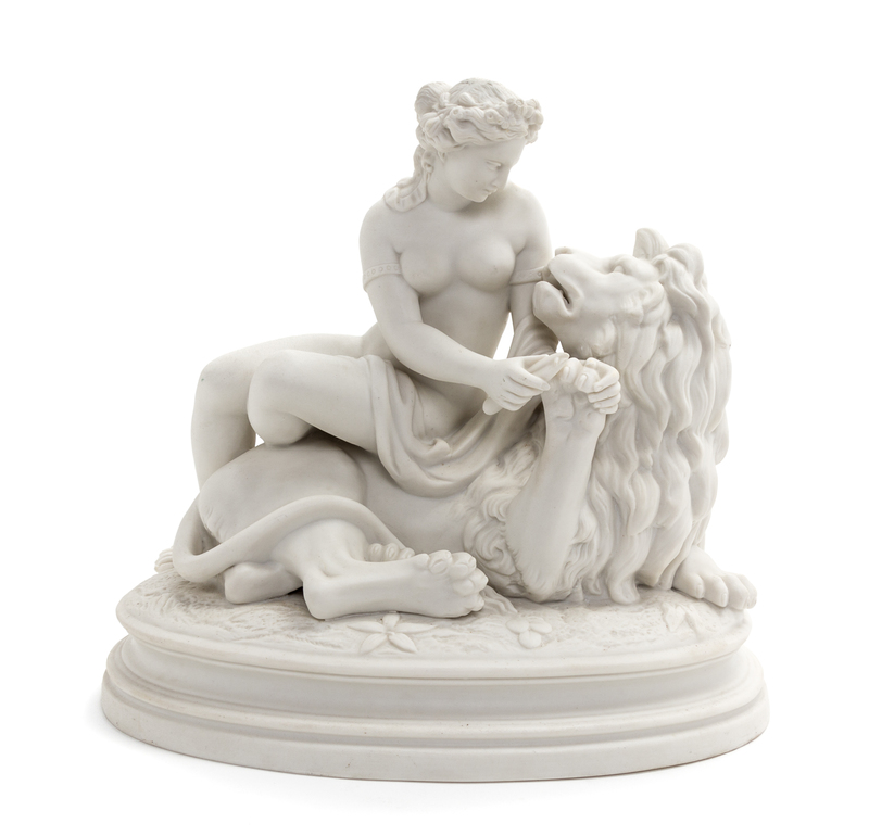 depicting Aesop's fable The Lion in Love, modeled as a nude maiden seated atop a recumbent lion, raised on a molded oval base.