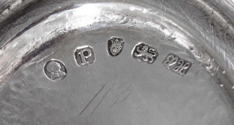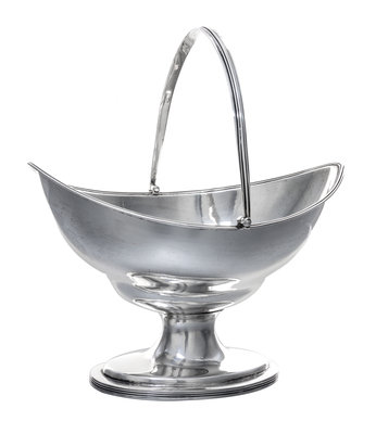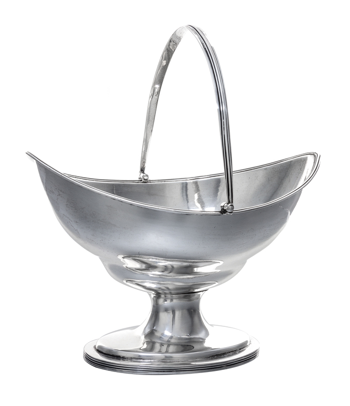 of oblong form with a reeded edge and a swing handle, raised on a similarly worked oval foot.