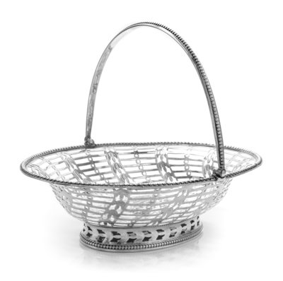 of oval form with a beaded edge and a swing handle, the sides of the basket worked to show foliage, incised A.L.A. 1780 to the underside.