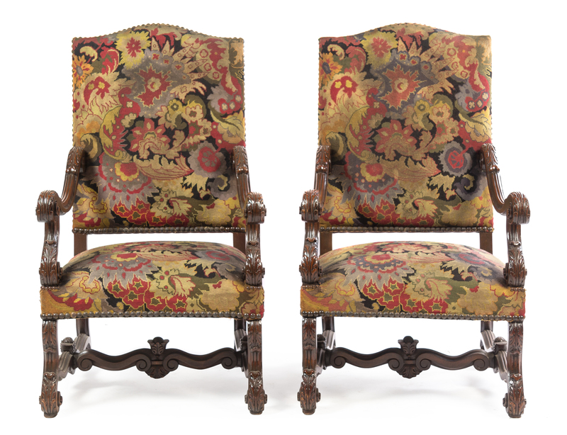 each having a needlepoint upholstered back and seat, with acanthus carved hand holds, legs and stretchers.