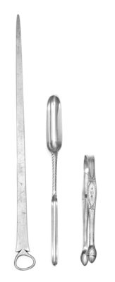 comprising a roasting spit, a marrow scoop and a pair of sugar tongs.