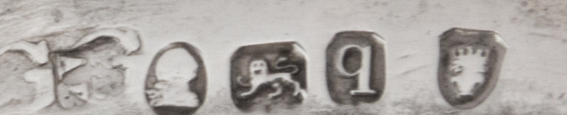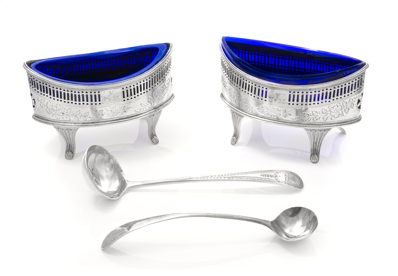each of oblong form, worked to show floral sprays and incised F J M, with cobalt glass liners and associated spoons.