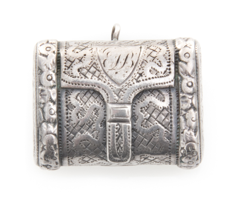 the case worked to appear as a satchel with floral decorated borders, opening to a gilt interior with a pierced floriform screen.