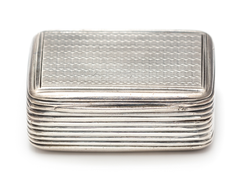 the lid and underside worked with engine turned decoration, the sides with ribbed banding.
