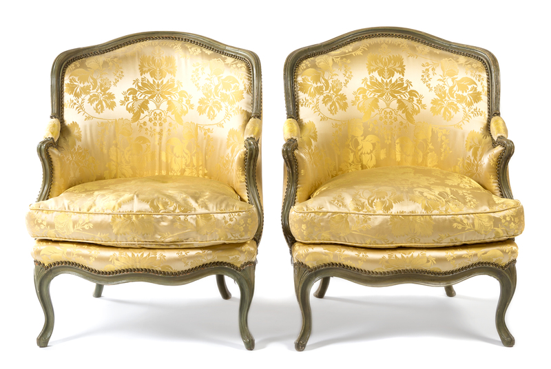A Pair of Louis XV Green Painted Bergeres en Gondole