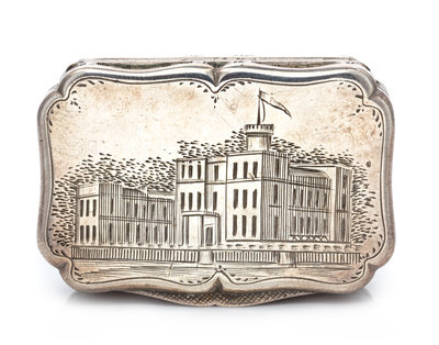 the lid decorated with a barracks building.