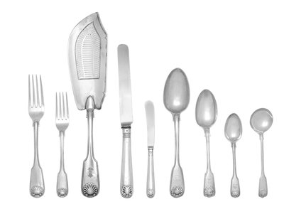 Fiddle, Thread and Shell pattern, comprising:12 dinner knives12 luncheon knives12 butter spreaders14 dinner forks11 luncheon forks12 salad forks11 teaspoons12 soup spoons12 bouillon spoons1 serving spoon1 carving fork1 fish servicetogether with 5 George III Shell & Fiddle pattern teaspoons.