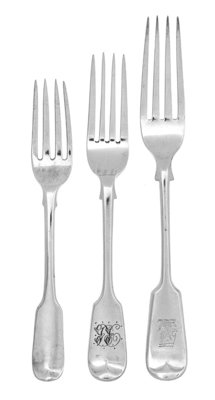 Fiddle and Thread pattern with upturned handles, some engraved with script monograms or crests, comprising:13 dessert forks18 dinner forks12 luncheon forks
