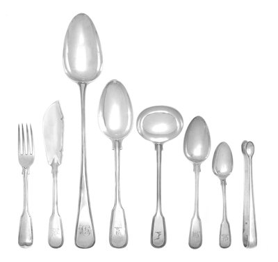 Fiddle and Thread pattern, comprising:10 dinner forks5 salad forks12 dessert forks30 teaspoons13 soup spoons9 table spoons8 demitasse spoons3 sauce ladles1 large serving spoon1 master butter knifesugar tongs