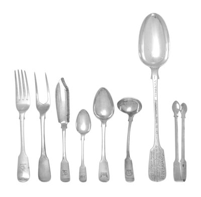 Fiddle pattern, comprising: 6 dinner forks6 salad forks18 teaspoons1 tablespoon1 citrus spoon3 serving spoons1 cream ladle1 meat fork1 master butter knifesugar tongs