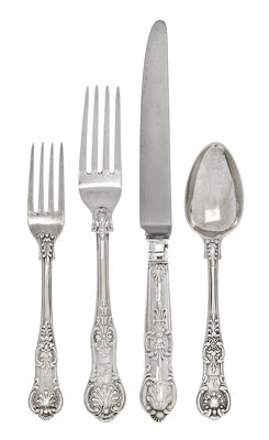 Queen's pattern, comprising:12 dinner forks12 dessert forks12 dessert spoonstogether with:12 dinner knives, C.J. Vander Ltd., Sheffield, 1980