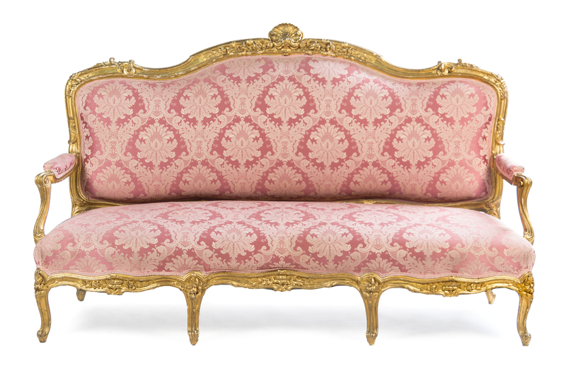 having a shell and floral carved crest rail over a damask padded back, padded arms and a stuffover seat, raised on cabriole legs.
