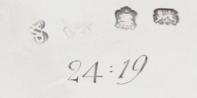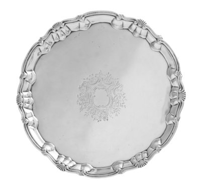 having a shell border and chased with foliate design surrounding a vacant cartouche, raised on three pad feet.