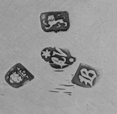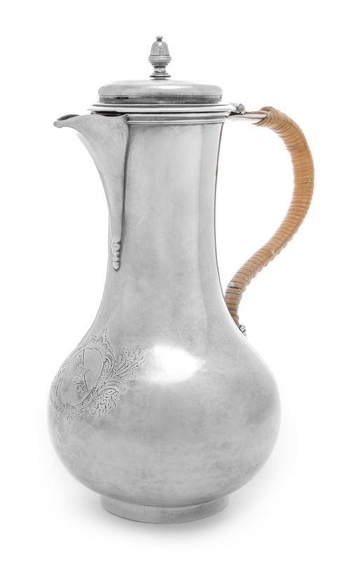 of baluster form with a raffia-wrapped handle, engraved on the body with a coat of arms.