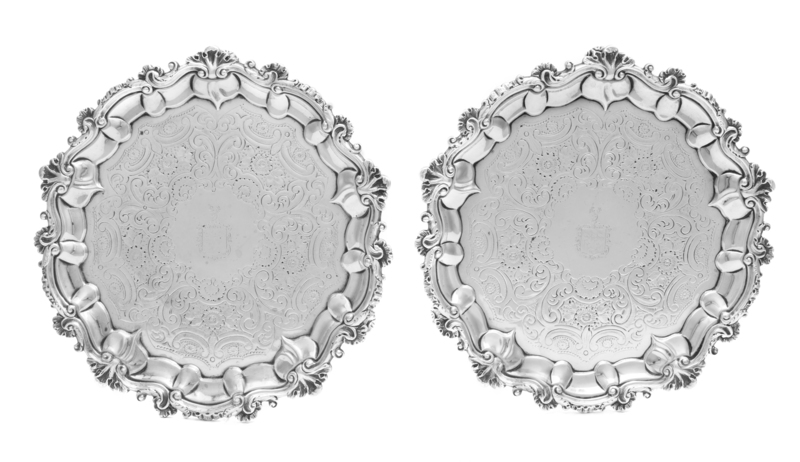 each circular border with rocaille work spaced by shells, the centers engraved with stag crests and coats of arms, probably later engraved with foliate C-scrolls and raised on volute feet.
