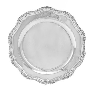 each having an undulating gadrooned rim and engraved with a contemporary coat of arms, the arms of Gore impaling Connolly for Sir Ralph Gore, further engraved with later stag crests and coronets, one plate made by unknown maker T.J., London, 1768.