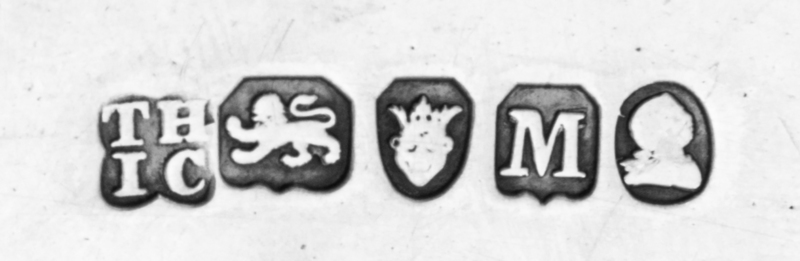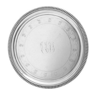 having a gadrooned rim, centered by an engraved monogram with a stippled acanthus and volute border, raised on three feet.