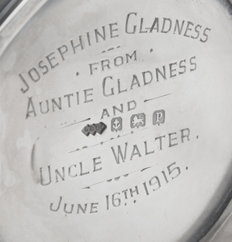 in the Arts & Crafts taste, with spot-hammered surfaces and stylized chased cherry clusters, the underside engraved Josephine Gladness from Auntie Gladness and Uncle Walter / June 16th 1915.